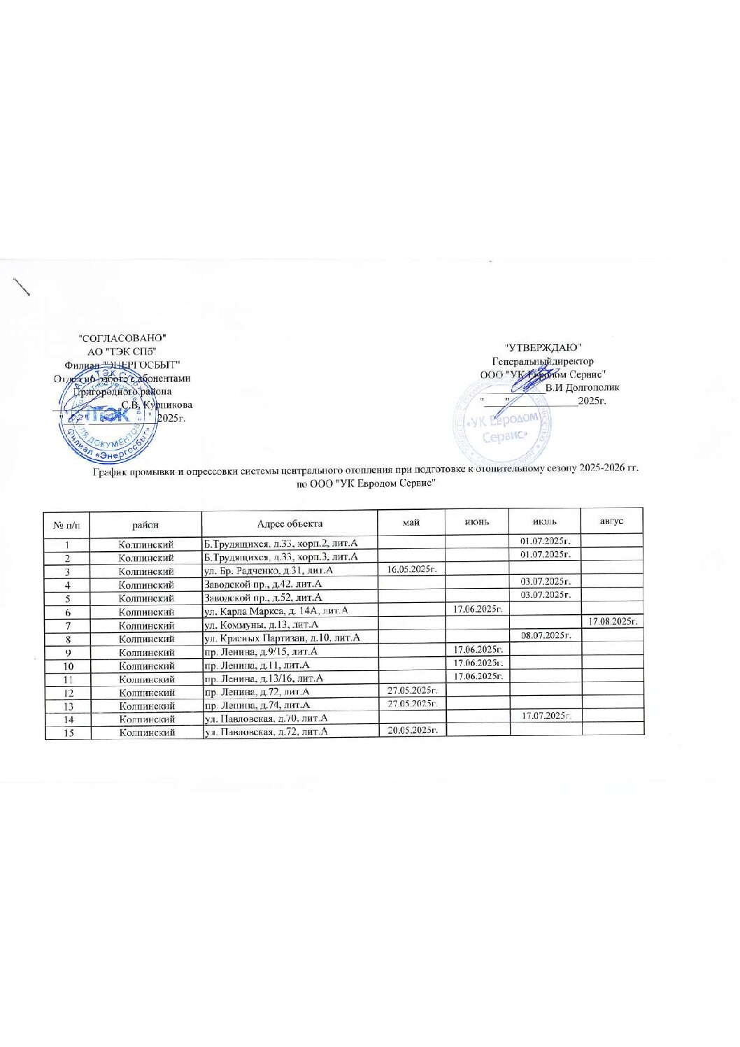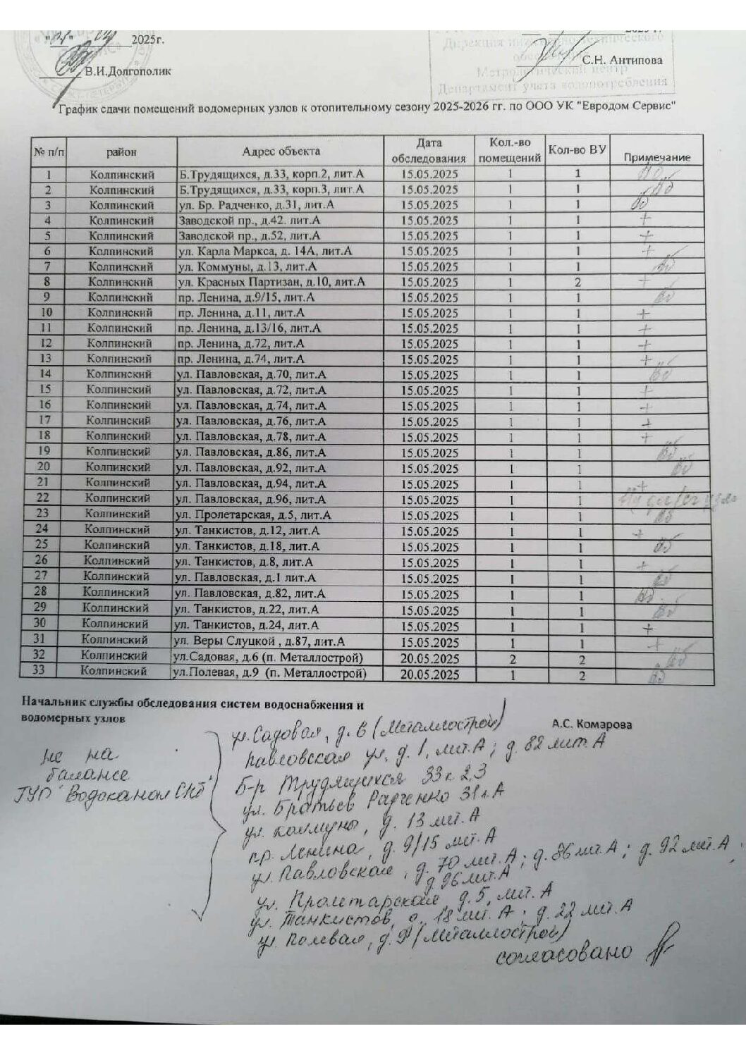 График сдачи помещений водомерных узлов к отопительному сезону 2025-2026